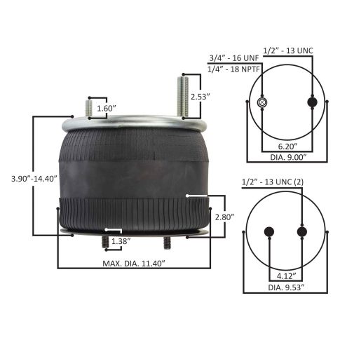 Extended length:13.00"Compressed length: 3.70"Rolling lobePlastic base. CROSS REFERENCES: ABP N32 019422, GYR 1R11 028, M7-8422, FLT1R11028, VTTAS9422, 9422